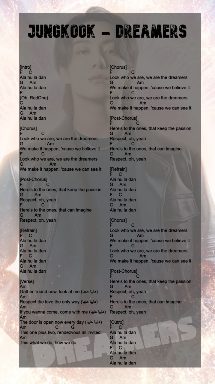 JungKook 정국 - Dreamers 기타 코드 피아노 악보 가사 guitar chords piano score lyrics 드리머스